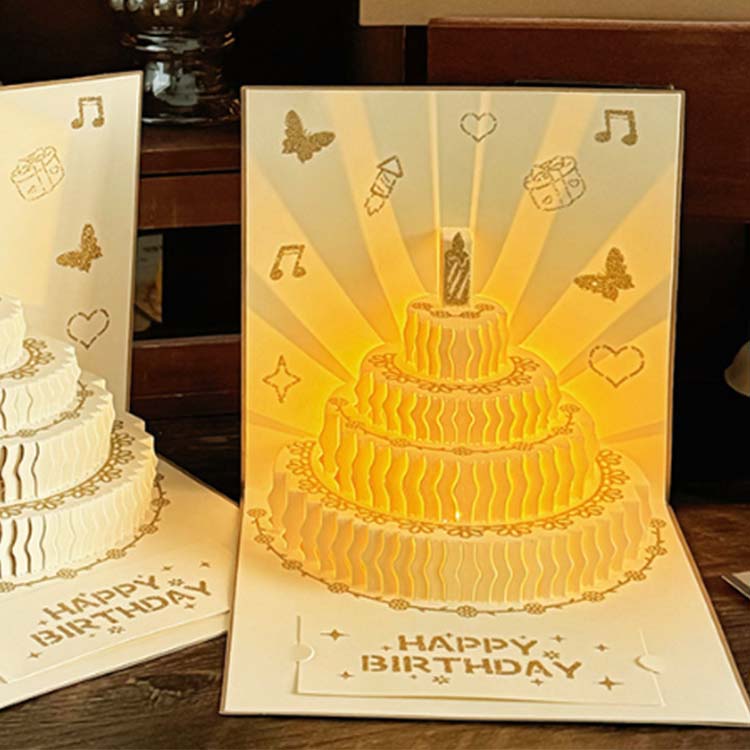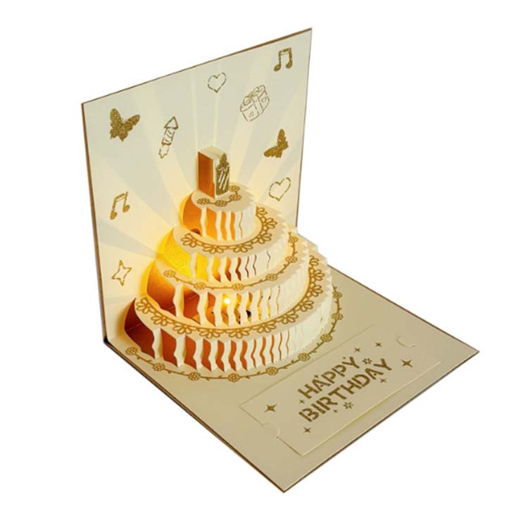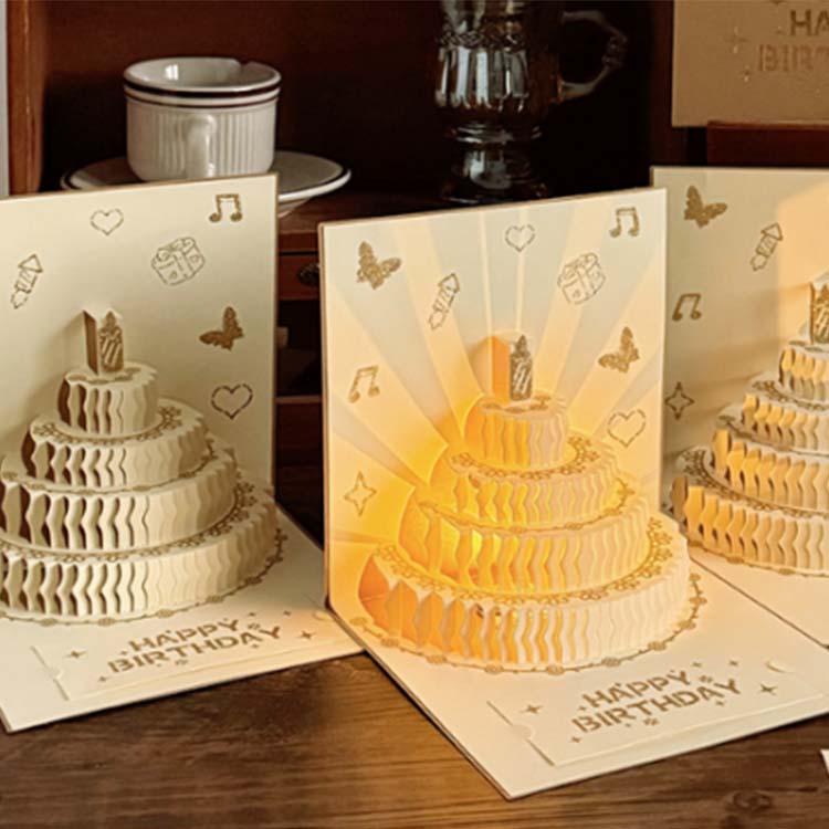 3D -листівка на день народження - це новий продукт у категорії вітальних листівок. Виготовлений з екологічно чистих та безпечних матеріалів, він має тривимірну форму та внутрішнє освітлення та музичні ефекти. Компактний і портативний, він складається з конверта, картки та невеликої картки. Це всебічна листівка до дня народження, яка поєднує класичні та сучасні елементи.