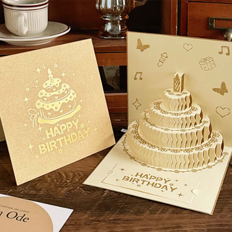 Обкладинка 3D -листівки до дня народження виготовлена з кольоровим процесом тиснення. У його інтер'єрі є дизайн 4-шарового торта, а для вітального повідомлення додається невелика вітальна листівка.