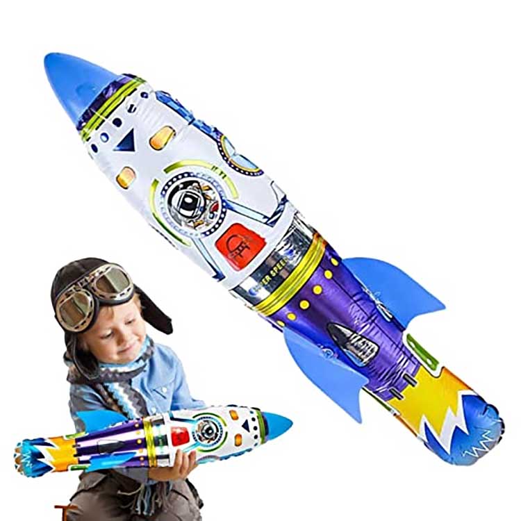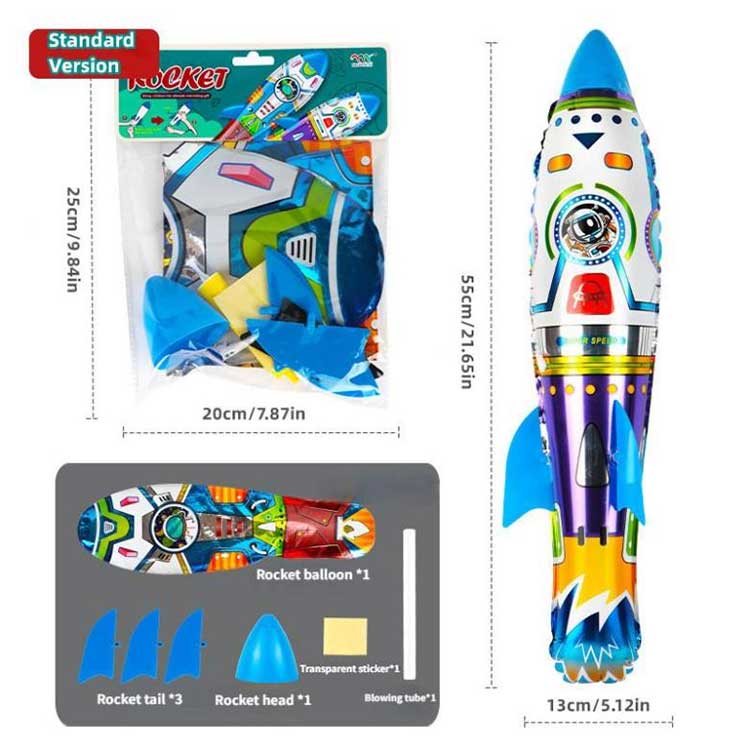 Тривимірна надувна ракетна фольгована повітряна куля — це довга надувна іграшка неправильної форми з візерунками, пов’язаними з ракетами, надрукованими на її поверхні. Головний і хвостовий плавники потрібно збирати вручну, а потім встановлювати після надування. Виготовлений з алюмінієвої фольги, його нелегко розбити та він міцний. Підходить для використання в декораціях вечірок на тему космосу, а також для дитячих ігор. реквізит.