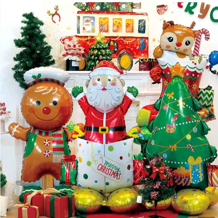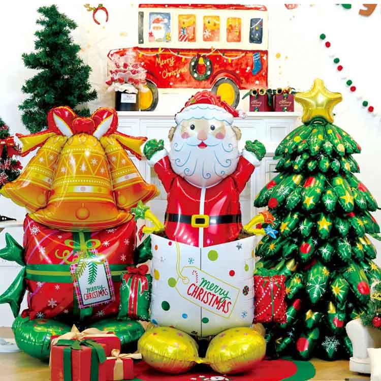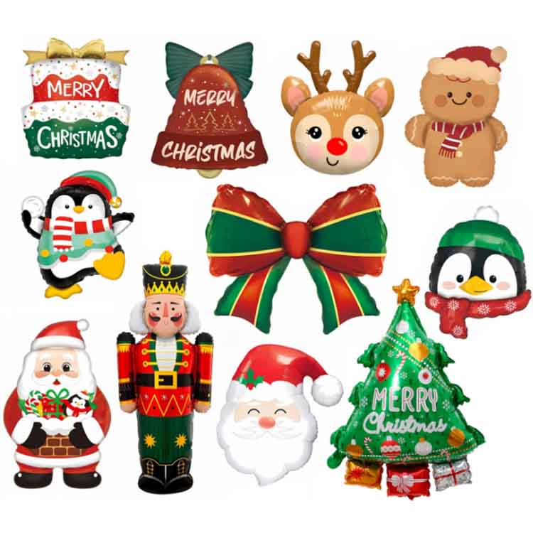 Різдвяні повітряні кулі з алюмінієвої фольги містять різдвяні елементи у своєму дизайні. Ці повітряні кулі доступні у класичних формах, таких як Дід Мороз, ялинки, сніжинки та дзвіночки, прикрашені гаслами «З Різдвом Христовим». Кольори включають різдвяні елементи, головним чином різдвяні кольори, такі як червоний, зелений, золотий і срібний, що створює святкову атмосферу. Доступні в широкому діапазоні розмірів, від міні-30 см до гігантських 100 см, вони задовольняють різноманітні декоративні сценарії та потреби.