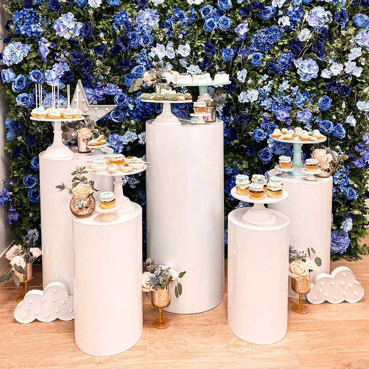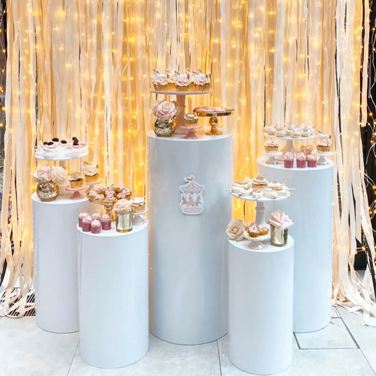 Десертний столик циліндричної форми служить одночасно і вмістилищем, і прикрасою. Зазвичай вони представлені в різних комбінаціях: комбінації з 3 частин, комбінації з 5 частин, комбінації з 7 частин і так далі. Найпоширеніша комбінація - п'ять штук. Незалежні циліндричні труби різних розмірів можна гнучко розташувати, і вони є важливою частиною сцени. У той же час ми також пропонуємо налаштування розміру та форми. Більше того, вони пасуватимуть до декорацій вашої вечірки.
