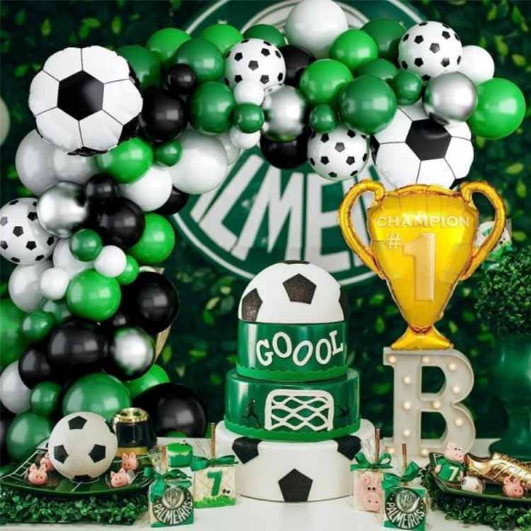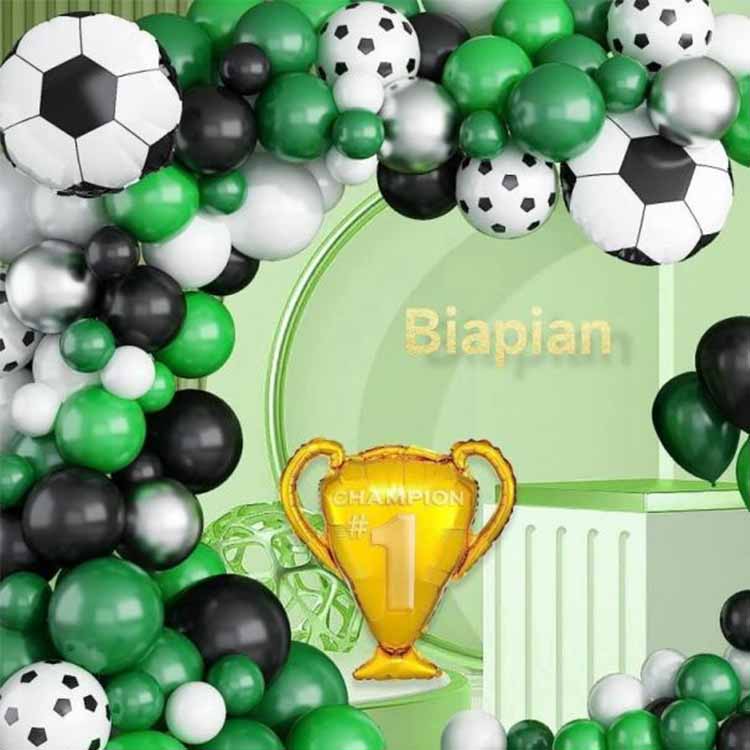 Комплект арки з повітряними кульками на футбольну тематику містить зелені, чорні та білі повітряні кулі як основні компоненти, а повітряні кулі у формі футбольного м’яча додані як прикраси, щоб створити виразне тематичне декоративне тло. Цей продукт спеціально розроблений для футбольних подій, вечірок на футбольну тематику, діяльності футбольного клубу тощо, створюючи жваву атмосферу та надихаючи більше людей любити футбольні заходи.