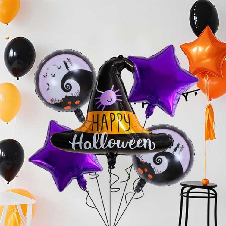 Хеллоуїн на п’ять частин - це набори повітряної кулі, спеціально розроблений для Хеллоуїна. Зазвичай він складається з повітряних куль, повітряних куль та інших аксесуарів. Він включає в себе п’ять типів повітряної кулі! Кожен набір має візерунок або персонаж, який ідеально відповідає темі Хеллоуїна. Ідеально підходить для прикрас Хеллоуїна, ви навіть можете наповнити повітряні кулі гелієм, щоб змусити їх плавати! Це справді посилює таємничу атмосферу Хеллоуїна!