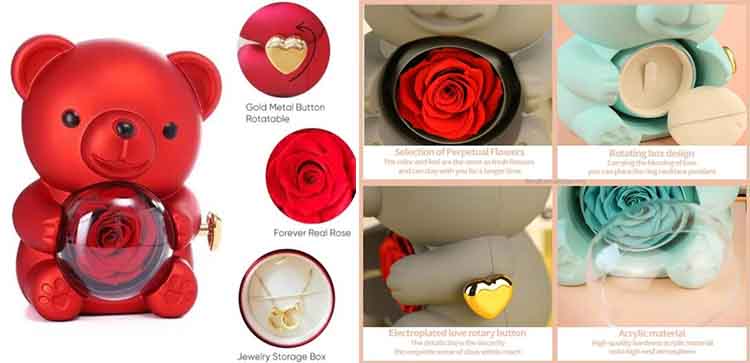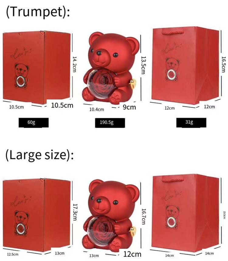Збережений квітковий сюрприз-ведмедик доступний у двох розмірах: великий і малий. Ви можете вибрати розмір, який вам подобається відповідно до ваших потреб! Слід зазначити, що намисто та каблучка на фото є реквізитом для фотосесії. Два розміри мають свої особливості, що дозволяє кожній емоції знайти правильний спосіб її передачі.