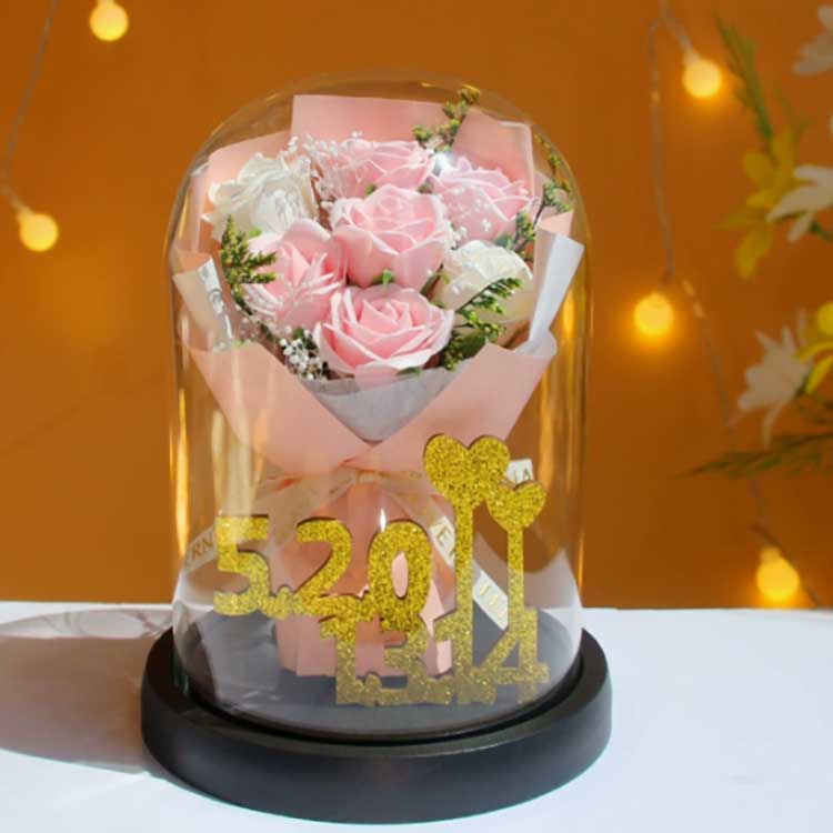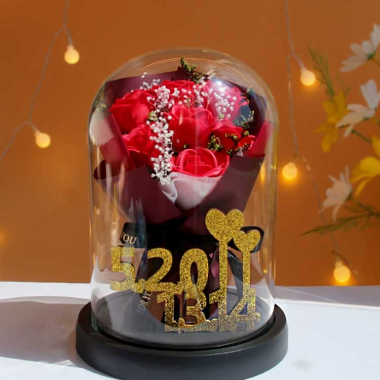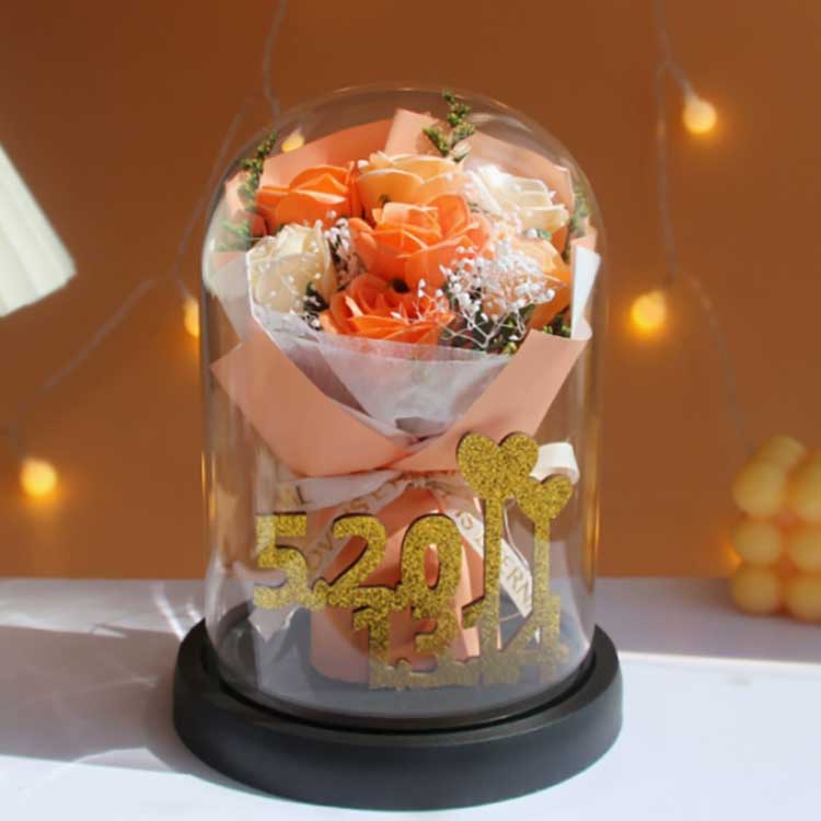 Цей скляний букет троянд створений для того, щоб квіти не в'янули, а троянди всередині не зів'янули. Букет дуже реалістичний, його майже не можна відрізнити від справжніх квітів, і він може дуже добре відобразити красу букета. Всередині золоті цифри 520+1314 представляють числа 520 і 1314, символізуючи любов і підкреслюючи продуманість цього подарунка.
